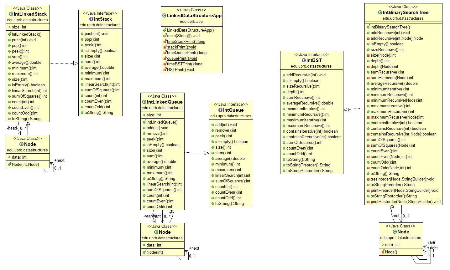 The IntLinkedQueue uses nodes to store integers in a linked list, following the FIFO (First-In-First-Out) principle for enqueue and dequeue operations. The IntLinkedStack employs nodes in a linked list, to the LIFO (Last-In-First-Out) principle for push and pop operations. The IntBinarySearchTree organizes nodes in a hierarchical structure, ensuring efficient insertion, deletion, and search operations using the binary search property. The app LinkedDataStructure is a Java application that shows how linked data structures are used.